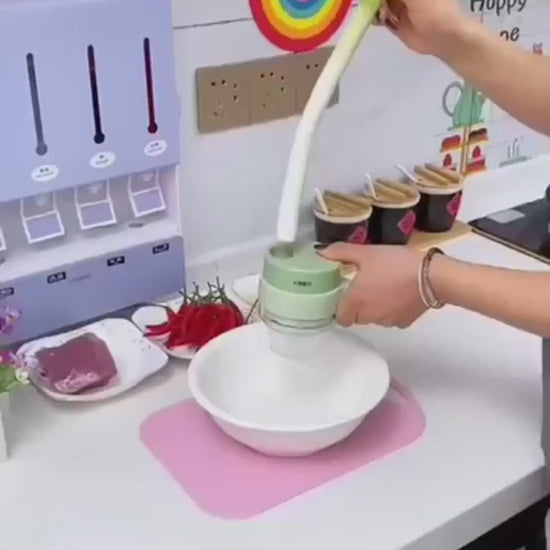 Effortlessly chop, slice, mince, and mash with this 4-in-1 electric vegetable cutter. Perfect for garlic, onions, and everyday cooking – no cords, just quick results!